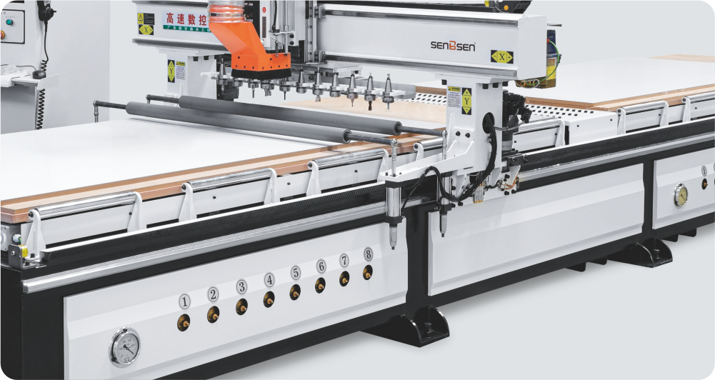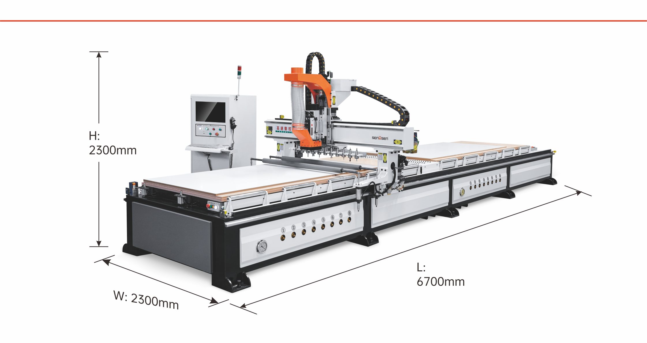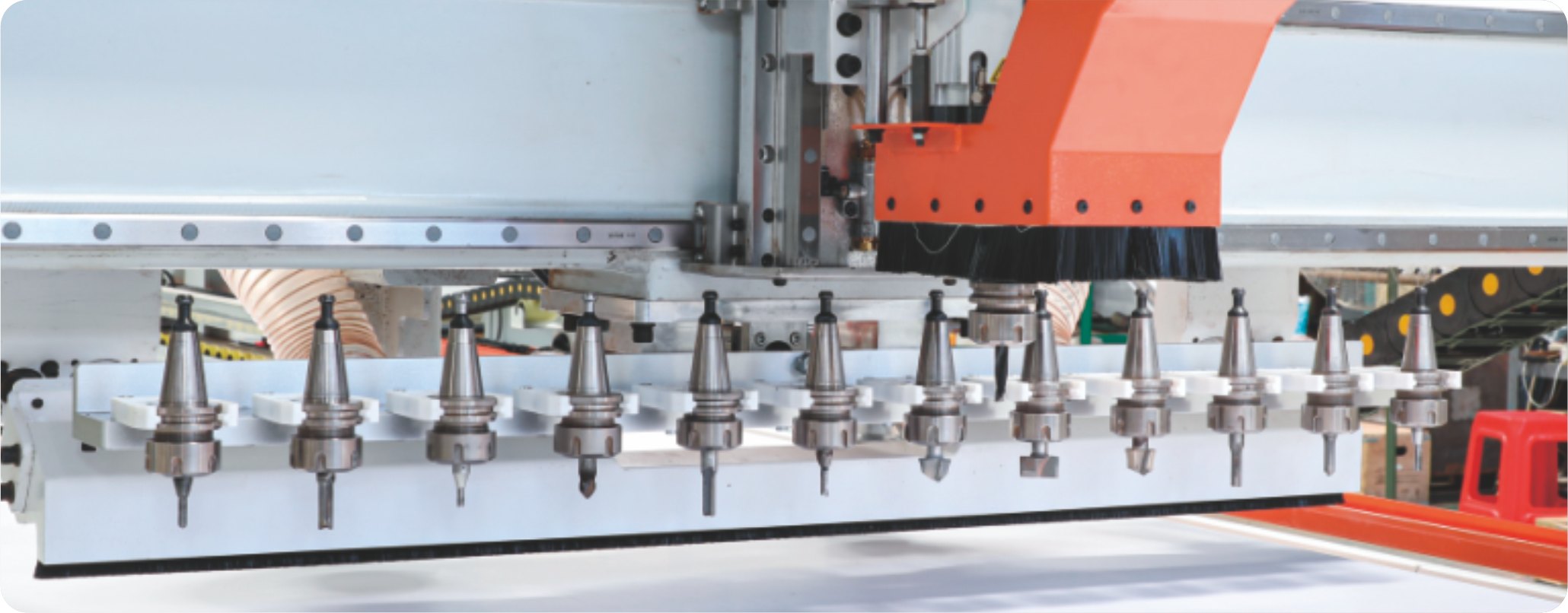 The integrated high-strength gantry body and dual station design achieve eficient and uninterupted production. The straight row tool changing magazine comes standard with 12 knives, which can quickly complete various processes such as cuting, drling, loting, miling, etc, it is compatible with multiple disassembly software and is an efficient tool for panel furniture production.