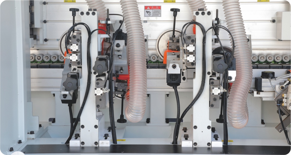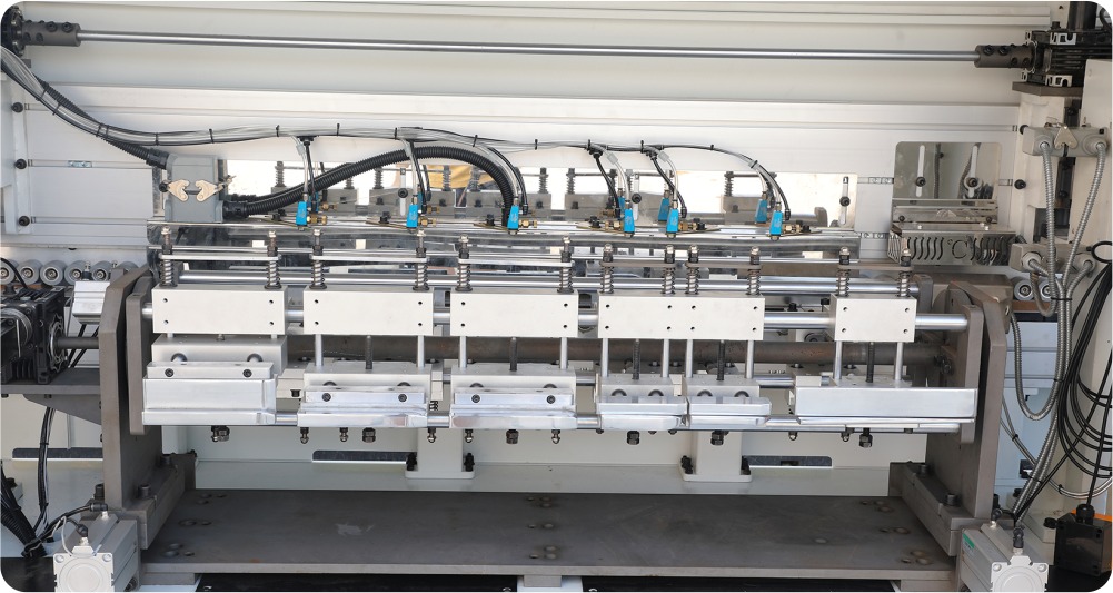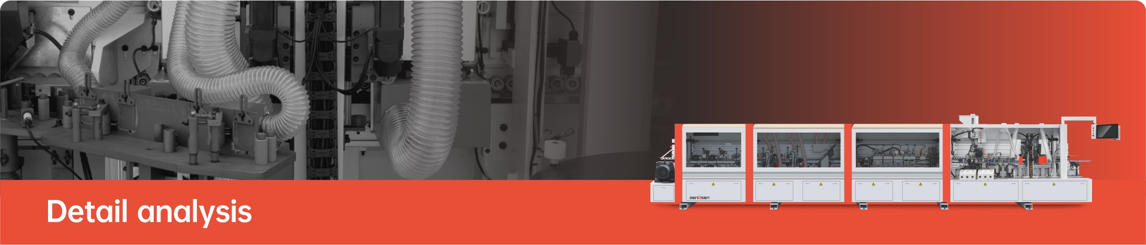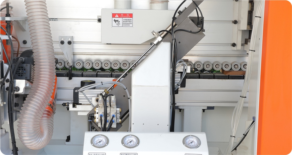 By using a cylinder to push the pressure wheel, the edge banding is tightly adhered to the board, and a multi-stage pressure wheel design is adopted to achieve uniform force and improve the bonding effect